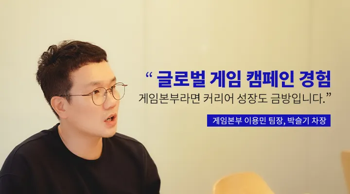 용민 : 안녕하세요. 게임본부 이용민 본부장입니다. 저희 본부는 한국의 내로라하는 게임 퍼블리셔 (넷마블, 카카오, 라인게임즈, 펍지)와 함께 일하고 있습니다. 해당 고객사들의 국내외 캠페인을 직접 운영하면서 디지털 마케팅, 퍼포먼스 마케팅 전반을 대행하고 있습니다.